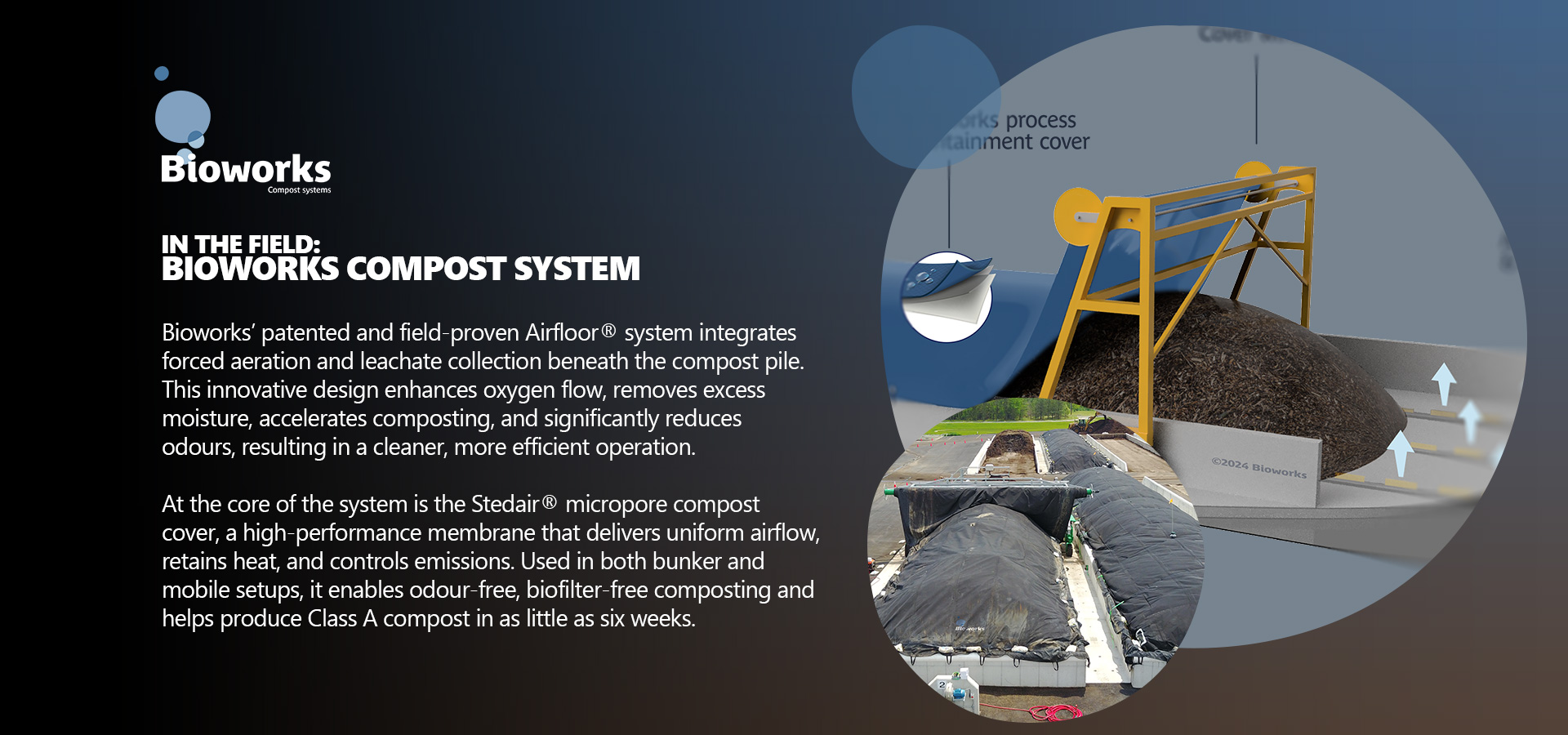 Les couvercles de compost microporeux sont spécialement conçus pour la technologie de compostage sur tas statique aéré (ASP) ayant la porosité appropriée (7-12 cfm/yd2 en moyenne) pour correspondre étroitement aux caractéristiques de la demande en oxygène de la matière première organique. Les housses de compostage Stedair®️ maintiennent également un environnement optimal dans le tas en contrôlant la température et l'humidité pendant la phase de compostage actif.